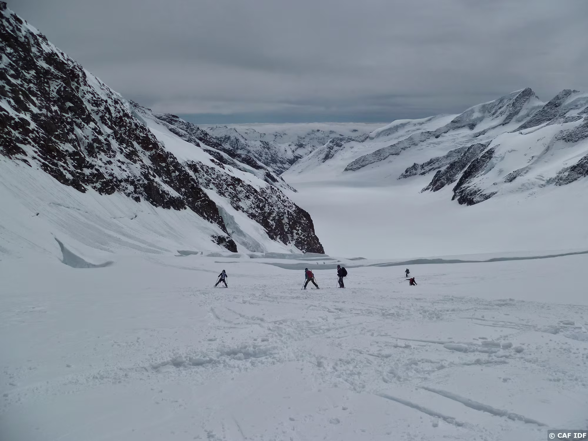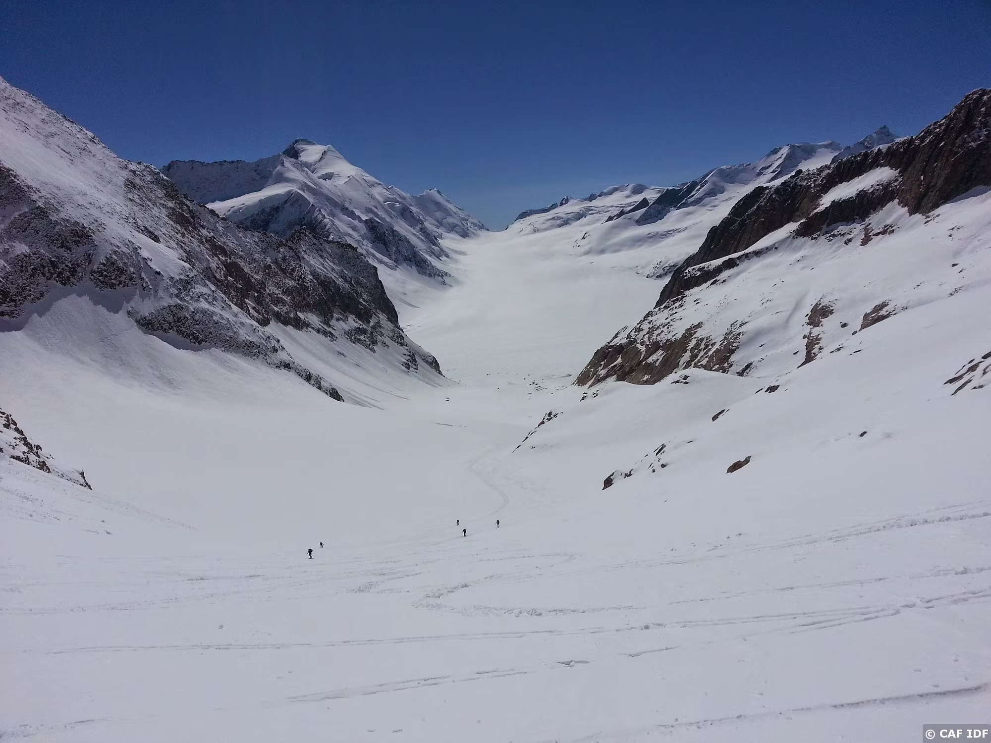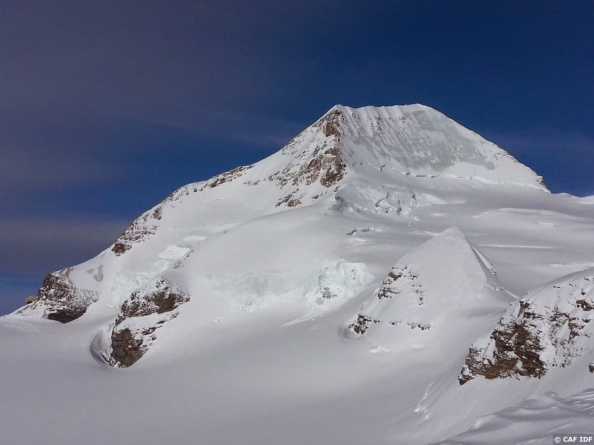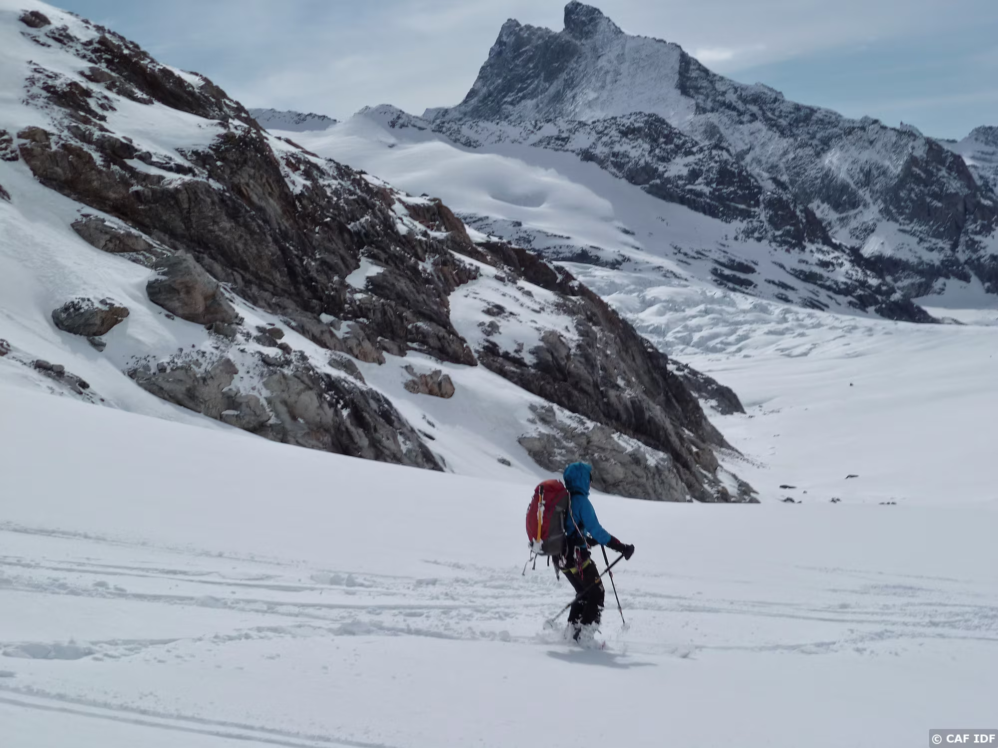 Montée au Finsteraarhorn en évitant les plaques du couloir au dessus du refuge. Elle est tracée jusqu'au col...et après?